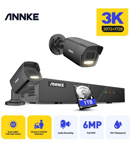 Key features: NVR: ★Visualisation, enregistrement et lecture en direct haute définition 6MP en temps réel ★Caméra IP avec jusqu'à 8 canaux connectables avec entrées PoE intégrées ★La compression avancée H.265+ réduit efficacement l'espace de stockage jusqu'à 75 % ★Lecture intelligente pour améliorer l'efficacité de la lecture ★Prise en charge de la surveillance à distance mobile de l'iPhone, de l'iPad et d'Android ★Vision Annke pour une surveillance à distance facile Camera: ★ Caméra réseau IR 3K avec échelle d'image 16:9 ★ L'objectif 2,8 mm @ F1,6 donne vie à tout ★ Technologie de compression H.265+ efficace ★ Détection de mouvement 2.0 avec détection d'humains et de véhicules ★ Smart Dual-Light : technologie avancée à longue portée ★ Vision claire de jour comme de nuit avec 3D DNR et 120 dB WDR ★ Microphone intégré pour une sécurité audio en temps réel ★ Prend en charge le stockage intégré jusqu'à 512 Go (emplacement pour carte SD) ★ Indice de poussière et d'étanchéité IP67 ★ Prend ...