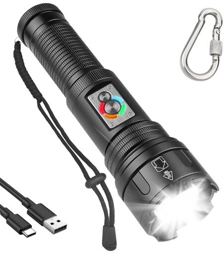 Ultra Powerful Lighting: This LED torch offers a power of 20000 lumens with XHP360 technology, ensuring intense light and long distance range. Ideal for emergencies, camping, and all outdoor activities. 10 lighting modes: With 10 different lighting modes, including strobe and SOS modes, you can adjust the lamp to your specific needs, whether it is general lighting or signaling in case of emergency. Rechargeable: This lamp is rechargeable, which allows you to use it economically and conveniently. It also offers a soft light, ideal for illuminating your campsite without disturbing the environment. Zoomable and adaptable: Thanks to its zoomable function, this torch allows you to change the intensity and width of the light beam according to your needs. Ideal for high range or more focused lighting depending on the situation. Water resistant: With IPX5 certification, this torch is water and dust resistant. Perfect for outdoor use, even in the rain, it can accompany your outdoor adventures worry-free. ...