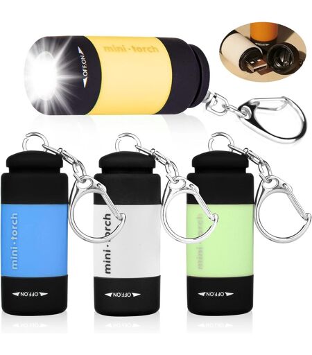 Pack of 4 mini LED flashlights: size 52 x 22 mm, weight: 25 g. The kit contains 6 colors of mini flashlights in sky blue, green, yellow, white. The mini flashlight is small and light enough to fit in a pocket, backpack or wallet. EASY TO CARRY - USB mini flashlight for kids with keychain and non-slip case, not easy to fall off. The sturdy flashlight works even if it falls. IPX8 waterproof, suitable for outdoor use. Practical LED flashlight, can be carried in the car or in a bag or recorded outdoors. Easy to Use Just turn the ""OFF/ON"" end of the flashlight to turn on the flashlight light and turn the tail counterclockwise to turn on the USB charging. Even children can use it easily. Built-in USB Interface - Mini flashlight for kids with built-in rechargeable lithium battery and USB interface, it saves space and avoids the hassle of losing the charging cable and storing the charging cable. 30 minutes charging, with normal use, it can work up to 12 hours. MULTI-PURPOSE FLASHLIGHT The mini led flashlight kit can be used in a variety of situations. Portable and compact size, the flashlight is ideal for outdoor camping, hiking, hunting, hiking, fishing, reading and emergency at night. The mini flashlight can not only be used for lighting, but also as a birthday gift for children. ...