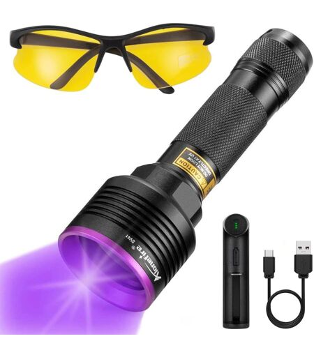 Uses 395nm UV LED source rather than diode lamp, up to 10W power consumption and 2400mW light output, making it a professional ultraviolet flashlight for professional use The case uses high-quality aluminum alloy, which greatly improves its heat dissipation performance, making the flashlights more reliable and durable Includes high capacity rechargeable battery and battery charger with battery indication, the charger has overheating and overcharge protection, allowing you to use the flashlight more convenient, no need to buy additional accessories. With anti-ultraviolet glasses, the anti-ultraviolet coefficient is UV400, it is recommended to wear the glasses when using an ultraviolet flashlight, and not let ultraviolet rays directly touch the eyes Powerful multifunctional applications. UV rays can reveal spots or fluids invisible to the naked eye on the ground or even on grass. Such as detecting counterfeit documents, checking money, amber and jewelry detection, urine and pet stain detection ...