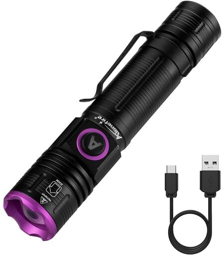 [Quality 365nm UV LED]This UV light flashlight uses high quality 365nm UV LED as a light source, up to an amazing power consumption of 5W and a light output of 1000mW, making it a professional black light for some professional uses. [Adjustable Focus]Zoom allows you to change the beam pattern from a focused beam to a flooded beam, the ability to arbitrarily adjust the light range allows you to choose between detecting fluorescent reaction phenomena over a larger range, or focusing on a small area to focus a higher energy density for resin curing. []The black light flashlight housing uses high-quality aluminum alloy, which greatly improves its heat dissipation performance, extends the life of the lamp, and makes the black lamp more reliable and durable. [USB C RECHARGEABLE]This UV light flashlight is designed with USB C charging port, it can be inserted into the charging port without considering the front and back of the socket, making charging more convenient and easier. The charging indicator allows you to track the charging status of the power and makes the charging process safer. A large capacity rechargeable battery is included. [Wide Range of Uses]The ultraviolet flashlight is powerful and durable, suitable for detecting fluorescent substances not visible to the naked eye, including checking cat/pet urine, cat ringworm detection, currency authentication, scorpion detection, mineral detection, bed bug detection. It is great for curing resins, curing glue, and much more! [IPX5 Waterproof Level]You can use the black lamp in rainy weather, without worrying that it will be wet and cannot work, but do not submerge it. ...
