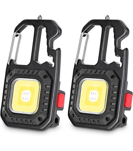 SUPER BRIGHT & 7 MODES This mini work light has 7 modes to meet your different needs: strong white light, low white light, strong warm light, low warm light, red light, red flash, long press 2-3 super bright in seconds. With up to 800 lumens of light, the COB work light provides a bright wide angle light, enough to illuminate your paths and dark places. USB RECHARGEABLE This rechargeable flashlight has a built-in 500mAh battery, the charging time is 5 hours and can stand by for 90 days. Comes with a USB-C cable that can be charged via USB port to connect the flashlight to a charger, power bank, laptop or car charger etc. 4 indicators are used to monitor the battery status at any time. Small and Portable Our COB keychain is small and lightweight, only 45g. The keychain flashlight is suitable for indoor and outdoor activities and is made of aluminum alloy and high quality ABS material. IP65 waterproof, good performance even in rainy days. Small and portable, safe and super bright for your use. MULTIFUNCTIONAL The mini flashlight is used not only as a work light, maintenance lamp, inspection light, emergency light, fishing light, rescue light and other lighting tools, but also can be used as bottle opener, wrench, screwdriver and window breaker for emergency situations. Widely Used The portable flashlight is equipped with a carabiner, screwdriver and tripod hole (tripod not included) which can be easily attached to a keychain or bag, which is very convenient. You can use it in different scenarios, for example for camping, hiking, repairing, walking, finding objects, hunting, fishing, etc.You can also give it to your family and friends. ...