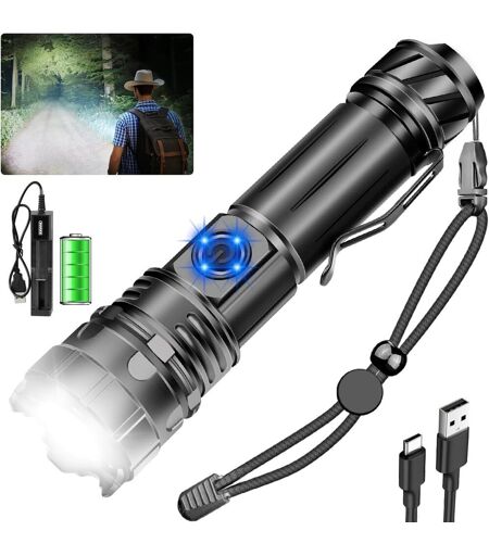 HIGH POWER FLASHLIGHT - Enjoy unparalleled brightness with our LED flashlight, featuring a 30W LED chip, 12000 lumens that illuminates up to 5 feet, perfect for your night adventures and emergency situations requiring a reliable hiking light. USB RECHARGEABLE - Never worry about running out of power with this rechargeable flashlight, featuring a USB-C fast charging port that can be used more than 150,000 times. Enjoy peace of mind and durability in all your outdoor activities. [5 Lighting Modes]Adapts to any environment with the 5 modes of this camping flashlight: High, Medium, Low, Strobe and SOS. Easily turn off the flashlight with a long press, providing convenience without cycling through each mode. Adjustable Focus for Improved Use Effortlessly switch between projector and projector by extending the torch head. This feature allows you to focus on distant objects or illuminate nearby areas, making it a versatile emergency flashlight. IPX65 Waterproof - Confront harsh weather conditions with confidence using this hiking light, made of durable aviation aluminum and IPX65 waterproof rating. Ideal for camping, hiking and fishing adventures in storms and snow.. ...