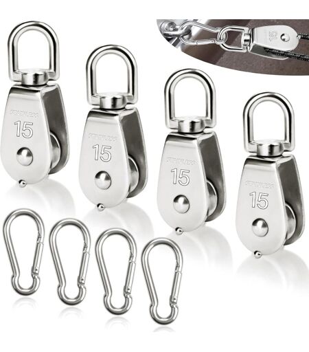 [Practical Kit] You will receive 8 pieces of SWTYExt hoist including 4 individual M15 hoists and 4 pieces M4 mountaineering buckle, pulley size: 60 x 20 x 15 mm, with a weight of 42 g, mountaineering buckle size: 40 x 4 mm/1.57 x 0.16 inches. 1.57 x 0.16 inches, with a weight of 20 g. g, a reliable choice for workshop, construction site or garden project. Premium Material The SWTYExt pulley and carabiner are made of 304 grade stainless steel, corrosion resistant, wear resistant and rust resistant. Even in adverse weather conditions, the stainless SWTYExt rope pulleys provide extra stability and durability. Max Load: SWTYExt M15 pulleys have a maximum load capacity of 35kg, while M4 carabiners can hold up to 50kg. They are suitable for ropes with a diameter of up to 6mm and can be used with ropes of different thicknesses/stainless steel ropes/pulley in this area. U SHAPE GROOVE - SWTYExt small pulleys are equipped with a precise U-shaped groove that ensures smooth and efficient traction while providing a secure connection to the rope. With the stainless steel pulley from SWTYExt you can easily lift and transport heavy weights without worrying about excessive friction or wear. Wide Application The SWTYExt traction system is ideal for indoor and outdoor use, including indoor and outdoor ropes, fitness projects, outdoor climbing, machine loading, cranes and sailing. ...