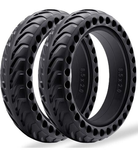 Full 50/75-6.1 Tyres: Precision engineered for sizes 8 1/2 x2 and 8.5''x2''. Tubeless design with integrated honeycomb core eliminates air pressure and inner tube maintenance Puncture Resistance: High-density rubber blend provides inherent cut resistance. Solid rubber construction eliminates the risk of glass or nail puncture in urban environments Improved Grip Technology: The dual-density tread compound with interlocking hexagonal base cells creates 360° surface adaptation. The wide 8.5 x 2 inch profile maintains optimal contact with the pavement during 25° tilts, while directional grooves channel water through cell voids for improved wet stability SHOCK ABSORPTION - Precision-engineered 50/75-6.1 honeycomb structure absorbs punctures by distributing shock across over 120 hexagonal cells, while tubeless ready design holds tire firmly on airless hub Maintenance-free use: The reinforced honeycomb walls can withstand loads of up to 150 kg (size 50/75-6.1). No air pump, no sealant, no pressure control is required. Durable compound retains shape despite temperature fluctuations (-10°C to 50°C) ...