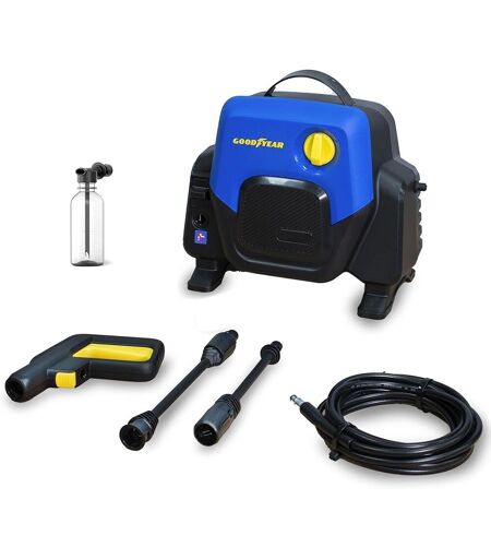 Nettoyage Efficace et Sans Effort Équipée d'un pistolet et d'une lance en PP et en Nylon, cette nettoyeur haute pression garantit un nettoyage efficace et sans effort à tout moment. Son système d'arrêt automatique intégré et son débit de travail de 4,5 l/min assurent des résultats impeccables avec un minimum d'effort. Compacte et Pratique Avec une longueur de tuyau de 5 mètres et un enrouleur de câble d'alimentation pratique, cette nettoyeur haute pression offre une flexibilité et un confort imum lors de son utilisation. Son design compact et ses dimensions de 299 x 174 x 260 mm la rendent idéale pour tout espace, même dans les zones difficiles d'accès. Polyvalence et Accessibilité Le nettoyeur haute pression Goodyear comprend une lance turbo réglable qui permet d'accéder à tous les coins avec un nettoyage puissant et des mouvements circulaires. Aucun coin ne résiste à sa puissance de nettoyage, ce qui en fait le compagnon idéal pour nettoyer voitures, outils, meubles de jardin, clôtures, chemins et bien plus encore. Qualité Garantie Soutenue par la qualité reconnue de la marque Goodyear, cette nettoyeur haute pression offre une durabilité, une efficacité et des performances exceptionnelles à chaque utilisation. Son filtre intérieur avec connecteur rapide garantit un nettoyage sans complication, tandis que son poids léger de 5,3 kg la rend facile à transporter et à ranger. ...