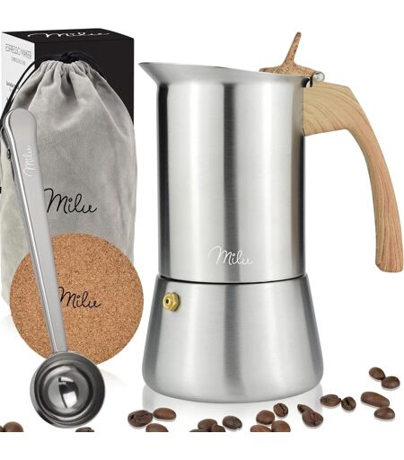 QUALITÉ SUPÉRIEURE... Milu util un acier inoxydable 430 de haute qualité et inoxydables. Sans aucune substance nocive, inodore et sans goût en d'autres termes, un goût PUR. Absolument inoffensif pour la santé, résistant à la chaleur et fait pour durer. FONCTIONNALITÉ... En quelques minutes et étapes simples, vous obtiendrez un délicieux espresso à l'arôme puissant. Un mode d'emploi très simple ! Fonctionne sur tous les types de cuisinières, même les cuisinières de camping. EXCEPTION 2 tasses non adaptées à l'induction. DESIGN SUPÉRIEUR... Cette machine à espresso au design noble et classique apporte une touche méridionale à votre vie et vous permet de profiter pleinement de votre temps libre. Parfaitement conçue, elle vous permet d'abandonner toute machine à pour le bien de l'environnement. CONFORT... Quatre tailles différentes pour permettre aux vrais amateurs de frahling de rester flexibles. Toutes les pièces se démontent sans effort et peuvent être nettoyées au lave-vaisselle pour gagner du temps. Utilisation pratique d'une seule main. EXTRAS... De nombreux accessoires pour un plaisir prolongé une pour le nettoyage, un dessous de bouteille en liège pour une présentation élégante, un sac de transport pour la protection et le transport facile, une cuillère doseuse pratique et un joint de remplacement. ...