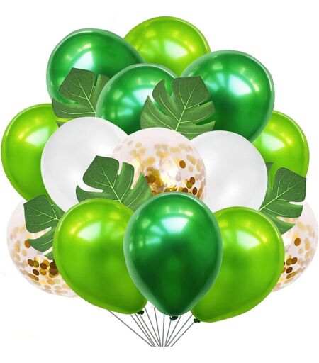 Jungle Green Balloon 15 dark green balloons, 15 light green balloons, 10 white balloons, 10 gold confetti balloons and 5 artificial tropical palm leaves. NON-TOXIC LATEX BALLOONS These party balloons are made of high quality material. Non-toxic and not easy to burst. They are safe to use and can play around children. Perfect Party Decoration These party balloons create a festive and lively atmosphere for your party, baby shower, wedding, birthday, Valentine's Day, anniversary, bridal shower, etc. Catch Beautiful Confetti Balloons Gently rub the balloon on a fleece blanket, or hair to generate static electricity, which allows confetti to stick inside the balloons. AIR OR HELIUM INFLATION These party balloons can absorb both helium and air. They are perfect for creating a stunning balloon garland. They can be hung on a transverse rope in the room or tied to form a large set of balloons. ...