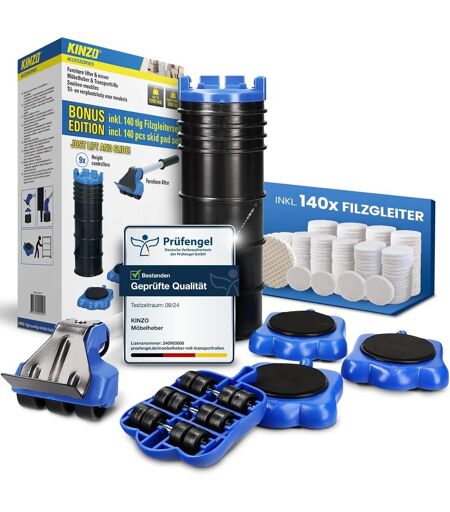 MOVING WITHOUT BACK PAIN - The Kinzo carry caster kit allows you to easily and effortlessly move furniture up to 1,200 kg FAST FURNITURE TRANFORMATION - Do you renovate or want to quickly move furniture without help? The practical furniture lifter lifts your washing machine, piano, cabinet, shelf effortlessly. The wheels are simply placed under the cabinet. It's ready BETTER THAN SKATEBOARDS - Flat transport casters are ideal for furniture with a short distance from the ceiling or reduced door heights: you don't need to tip furniture to carry it around In addition: to protect your floor: so that everything is within reach and that the floors are protected from the moment of installation, we deliver 140 felt gliders with: 96 round gliders of 20 mm, 36 round pieces of 15 mm and 8 round gliders of 37 mm Box contents: 1 x Kinzo transport aid set, consisting of 4 furniture castors with a load capacity of 300 kg each, 9 height adjustments for perfect adaptation to the transport of goods, 1 furniture lifter for extra heavy items, 140 felt gliders with round gliders 37 mm, 20 mm and 15 mm. Colorful packaging, also as a housewarming gift ...