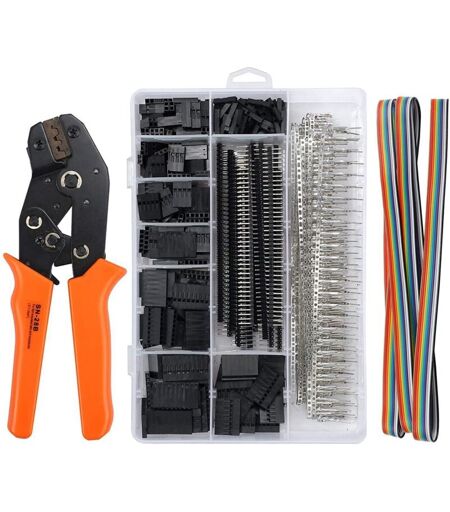 Ce kit de sertissage Dupont contient: 1 sertisseuse à cliquet + connecteurs à broches mâle / femelle (chaque 200 pcs) + connecteurs de boîtier de câble femelle dupont assortis (total 350 pcs) + embase pour broches à angle droit / plat 2.54 mm (total 800 broches) + 1 câble à ruban plat de couleur arc-en-ciel à 10 fils.Pince à sertir dupont robuste pour 2.54 mm, 3.96 mm, AWG28-18, Bornes 0.1-1 mm². Il est livré avec des mâchoires en acier au carbone trempé, le mécanisme de verrouillage et de libération automatique facilite grandement votre travail.Ce kit contient une gamme de logements femelles de fil de dupont, à savoir: connecteur 1 broche, connecteur 2 broches, connecteur 3 broches, connecteur 4 broches, connecteur 5 broches, connecteur 6 broches, connecteur 8 broches, connecteur 10 broches.Les en-têtes de broche de carte PCB à pas de 2.54 mm contiennent style plat et style angle droit, total 20 bandes avec 40 broches par bande. Facile à séparer en broches individuelles si ...