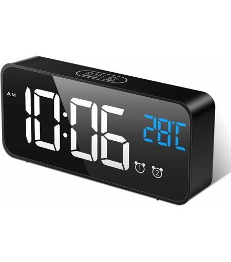 Ensoleille - Réveil Numérique, Horloge Digitale Réveil Matin Miroir led Grand Ecran Aver Température/Snooze/ 2 Alarme, Luminosité et Son Réglable,