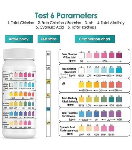 SNQ Bandes de spa au brome pour piscine 6 en 1, bandes de pH pour piscine, bandelettes de test de qualité de l'eau, chlore, brome, alcalinité, acide