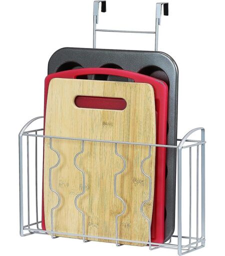 Description du produit : Veuillez mesurer avant l'achat : - Dimensions du panier (montage mural) : 13,5"" L x 9,5"" H x 3,62"" P - Hauteur au-dessus de la porte : 18,5 pouces Installations polyvalentes : - Peut être installé au-dessus de l'armoire, à l'intérieur de la porte de l'armoire ou fixé au mur. - Vis de quincaillerie incluses pour une installation facile. Organisez votre espace : - Idéal pour ranger les planches à découper, les moules à pâtisserie, les plaques à biscuits ou le film alimentaire en plastique dans la cuisine. - Parfait également pour organiser les fournitures de salle de bain. Conception protectrice : - Comprend un crochet ultra-fin avec rembourrage en mousse EVA pour s'adapter à la porte de votre armoire et éviter les rayures. Construction durable : - Fabriqué en acier robuste avec une finition argentée, conçu pour contenir 4 à 5 planches à découper ordinaires en toute sécurité. ...
