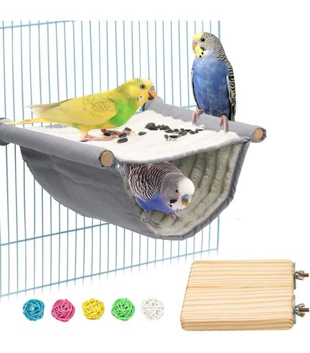WARM & COMFORTABLE:Our bird nest is made of luxury fiber which is warm and comfortable and feels good to the touch. It offers your pet friends a warm nest where your bird can rest and play. 2 Layers Design The 2-layer hammock design allows pets to move freely up and down. You can rest and play on the top floor or hide on the lower floor. This provides an interesting elevated space for small animals and boredom and improve the level of activity. DIMENSIONS The size of the bird hammock is 7.2 x 9 inches and the size of the bird seat tray is 4.7 x 4.7 inches, very well suitable for budgies, cockatiels, agapornids, parrots, canaries, hamsters, chinchillas, guinea pigs. EASY TO INSTALL We offer wing nut and screw for installation. You can install it in the bird cage or outside the cage as you like. No other tools required, very stable on the bird cage. After easy installation, your pet will receive a fun nest. Package contents: 1 x bird nest, 1 x bird seat board, 5 x rattan balls, you can freely combine, set up an ideal playground for small animals and have a happy time for the pet. ...