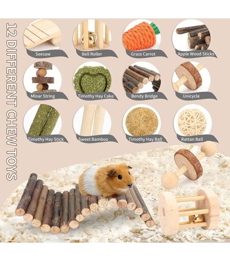 Hamster Chew Toys, Guinea Pig Hamster Cage Accessories, Small Animals Chew Toys For Chinchillas, Gerbils, Rabbit, Rabbit Hideout (12 Different Chew Toys)