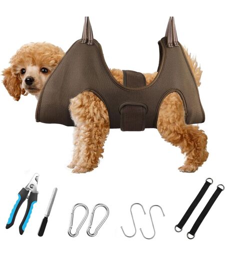 DOG Grooming Helper: Does your dog not let you cut his nails? - This dog care cradle helps your dog who was very active and nervous when trimming nails to calm down. It is also a good helper for cleaning teeth, eyes and ear drops. Small size: the distance between the hole is (9.5-25.5 cm), can hold up to 12 kg dogs. For most small dogs like French Bulldog, Poodle, Shih Tzu, Pug, Shiba Inu, Bichon Frise, Schnauzer, King Charles Spaniel and most puppies Durable material: the outer fabric is made of soft and elastic breathable mesh, which provides buffer protection. The interior uses a high-density knitted material that is easy to wash and durable. 6 in 1 grooming kit: 1 x dog nail cradle for maintenance, 2 x S hook, 2 x extension strap, 2 x mosquetons, 1 x nail clipper, 1 x nail net. Please choose the right size: Please measure the dog's body length and the distance between their front and back legs, and compare the size chart to choose the appropriate size. Please do the care after your baby calms down completely. We suggest you do this with an assistant. ...