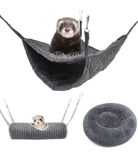 [Cute Bunk Hammock & Tunnel]Set includes tunnel hammock, bunk hammock and pet bed to enrich your pet home decor. The tunnel and hammock fill the nature of the tunnel and bring more fun to your pets. [Warm Material] - Made of high quality short plush, not easy to lose hair and soft enough to make your pets feel comfortable and comfortable. Its thermal protection keeps your little pet away from the cold, especially in winter, and keeps them warm and happy every day. EASY TO USE AND CLEAN - With metal hooks, the hammock and tunnel can be easily hung in the cages. You can decorate your pets' small house to give them fun and warmth. You can wash it by hand or machine. Note: Please note that it needs to be cleaned by removing the metal hooks. [Size] - Standing hammock: the length is 33 x 30 cm, the tunnel hammock: 36.5 x 11 cm and the window diameter 10 cm. Pet bed outer diameter 30 x 30 cm; suitable for more pets, such as ferrets, rats, fancy rats, hamsters, guinea pigs, sugar skates, squirrels, etc. Note: Please check the size before purchasing. [Warm Note] - Our hammock is constructed with excellent workmanship to carry pets and resist mischief. Their lifespan does not cover your pets biting, gnawing and chewing. ...