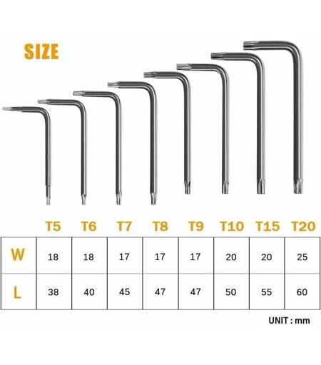 Union Clés Torx Coudée, Kit de 8 Pièces Clés Allen Torx, Tournevis Etoile T5 T6 T7 T8 T9 T10 T15 T20, Ensembles de Clés Outillage à Main Clés Hexagonales