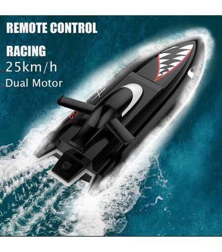 808 Dual Motor 25km/h Waterproof RC Boat 3.7V Battery 2.4GHz High Speed Rechargeable Speedboat Electric Remote Control Racing Ship Model ToysFeature:The shark pattern on the surface can bring you a better gaming experience.The dual motors can provide huge power to the boat, guaranteeing a stable and powerful driving experience.Single head design, effectively reduce water and wind resistance. The top speed can reach about 25km/h.The high-capacity battery lasts about 30 minutes.The 2.4GHz RC system can provide an interference-free environment where you can compete with your friends.Specification:Remote control boat:Model: 808Material: ABSColor: Black/RedFrequency: 2.4GHzMotor: BrushedMaximum speed: about 25km/hBattery: 3.7V 1200mAhCharging time: 60-80 minutesWorking time: about 25-30 minutesSize: 32x9.8x10.8cm/12.6x3.86x4.25inPacking size: 35x18x13cm/13.78x7.09x5.12inRemote control:Remote control distance: about 80mRemote control battery: 2 X 1.5V AA battery (not included)Note:Due to the different monitor and light effect, the actual color of the item might be slightly different from the color showed on the pictures. Thank you!Please allow 1-2cm measuring deviation due to manual measurement.01-02: 1 X RC Boat1 X USB Cable1 X Remote Control1 X Lithium Battery1 X Instruction1 X Bracket03-04: 1 X RC Boat1 X USB Cable1 X Remote Control2 X Lithium Batteries1 X Instruction1 X Bracket ...