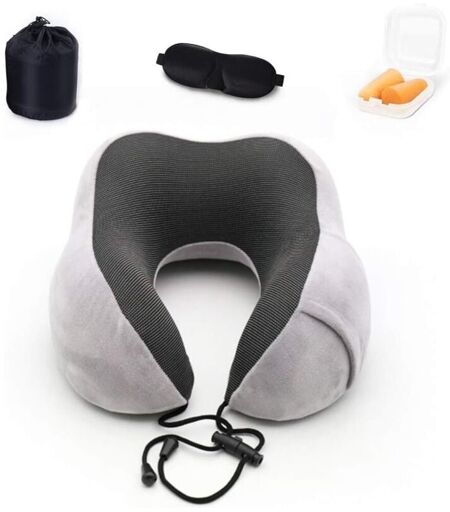 LITZEE Coussin de Voyage, Oreiller de Voyage Mousse à Mémoire de Forme, Coussin de Support Cervical pour Avion Train,Masque de Sommeil, Bouchons d'oreille