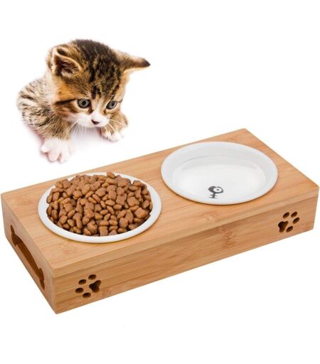 LITZEE Gamelle Ceramique Chat, Gamelle Chat Bambou Gamelle Anti Glouton Chats Gamelle Chat Double Gamelle pour Chat