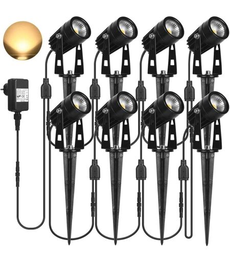 ?Luminaires de jardin LED Super lumineuses? Lot de 8 lampes de jardin 3W avec prise, blanc chaud 3000K, total 1440LM. La lampe de jardin peut fournir suffisamment de lumière pour votre jardin, cour, balcons, cour, escaliers, couloirs et allées. ?Spot de jardin étanche IP65 avec piquet de sol? Contrairement aux autres lampes de jardin traditionnelles, notre spot LED est étanche IP65 et le cable est étanche IP68, résistant au froid et aux UV. Le bo?tier et le cable résistant aux intempéries protègent la lumière du jardin de l'humidité et de la poussière; L'anneau métallique sur la queue peut améliorer l'effet imperméable, idéal pour une utilisation en extérieur et dans le jardin. Remarque: Le connecteur est IP44, veuillez le placer dan ?Adaptateur professionnel basse tension? 12V basse tension de travail, plug & play. Selon la conception différente de votre jardin, les lampes peuvent être agrandies ou réduites, vous pouvez connecter jusqu'à 12 lampes à gazon. 3W par lampe, pas plus de ...