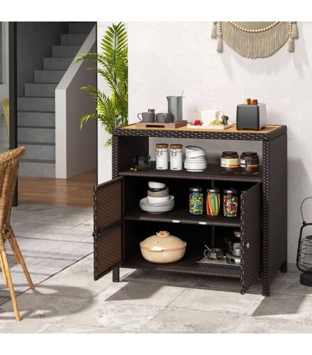 MAISONCHIC Armoire de Rangement Exterieur en Rotin Armoire de Jardin avec Plateau en Bois d'Acacia Compartiment Ouvert Buffet à 2 Portes Marron DESIGN IN