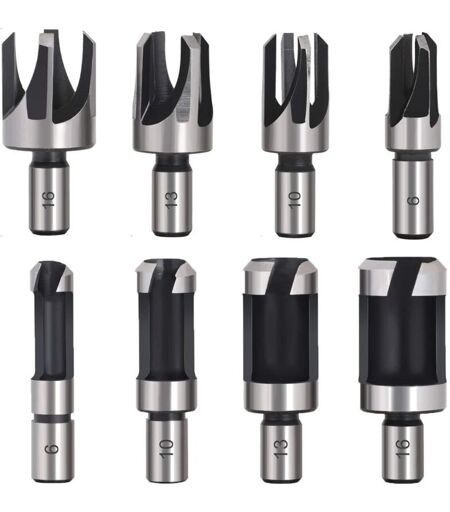 [Premium Material]--Carbon Steel, titanium-coated for extended working life [4 Size]--Wood plug cutter tool drill bits with 10mm shank, diameter sizes include 1/4";3/8";1/2";5/8" (6mm/10mm/13mm/16mm). you can use to create different size of plugs [Good Effect]--The 4 pcs standard cutters to eliminate imperfections in wood.The 4pcs chamfered cutters make tapered plugs to fill countersink holes.the plug cutter set makes perfect plugs for counter-bored holes 【Fit Machine]--Suitable for various drill with round shank, such as bench drill, pistol drill,handheld drill. We highly recommend use on drill press 【What You Get】--4 standard plug cutters and 4 four-tooth chamfered cutters ...