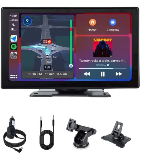 CarPlay sans fil et Android Auto : L'autoradio est compatible avec les smartphones iPhone et Android, offrant une expérience fluide et sans fil. Se connecter à CarPlay sans fil et Android Auto a été rapide et simple, me permettant d'accéder facilement à la navigation, aux messages et aux appels sans avoir à toucher mon téléphone, ce qui m'aide à me concentrer sur la route et améliore la sécurité pendant la conduite. Notre ecran voiture carplay deviendra votre compagnon de voyage inséparable Écran tactile IPS HD de 9 pouces et Plug-and-Play : Notre autoradio android est livré avec deux types de supports : un support adhésif et un support à ventouse, qui vous permettent de l'installer sur le tableau de bord ou le pare-brise. Il supporte flexiblement le choix de la méthode d'installation préférée et est très facile à installer. CarPlay sans fil est conçu pour être plug-and-play et est équipé d'un port allume-cigare USB-A, qui peut charger un autre appareil à tout moment Navigation GPS en ...