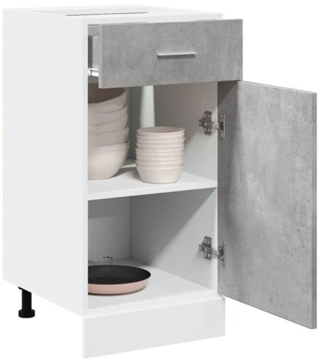 Cette armoire de plancher à tiroirs optimise votre espace de cuisine, offrant un espace de rangement suffisant pour vos effets personnels ! Matériau durable : le bois d'ingénierie est d'une qualité exceptionnelle avec une surface lisse et présente également résistance, stabilité et résistance à l'humidité. Fabriquée en bois d'ingénierie, l'armoire de cuisine est facile à nettoyer.Grand espace de rangement : l'armoire dispose d'un tiroir et de deux compartiments, offrant suffisamment d'espace pour ranger bols, assiettes, casseroles et autres ustensiles de cuisine.Porte pratique : gardez votre espace sans encombrement en cachant de petits objets essentiels derrière la porte du meuble de cuisine. Attention :Pour éviter qu'il ne bascule, ce produit doit être utilisé avec le dispositif de fixation murale fourni. Couleur : Gris béton Matériau : Bois d'ingénierie Dimensions : 40 x 46 x 81,5 cm (l x P x H) Nom de la gamme : Lyon Le plan de travail n'est pas inclus dans la livraison Assemblage ...