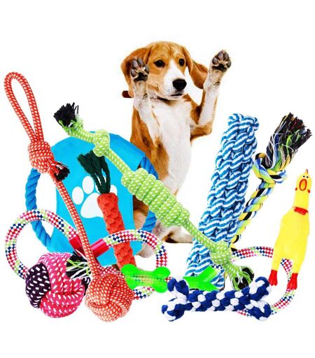 Grand assortiment de jouets pour chiens: variété de 12 paquets de différents jouets pour chiens? y compris les jouets grinçants? les cordes? les mordiller et les disques volants? offrez à vos chiens des heures et des heures de divertissement et d'exercice et pas besoin de se sentir mal en laissant votre chiot à la maison par elle-même chaque fois que vous allez au travail Super Durable: emballé 10 différents types de cordes robustes et extensibles? pas facile à mordre cassé par votre chiot? les garde occupés plus longtemps et moins de désordre autour de la maison Nettoyage dentaire: les toutous obtiennent le nettoyage des dents? le Massage des gencives et le soulagement du Stress en mâchant ces cordes Non toxique: bien fait de caoutchouc naturel non toxique et résistant. Sans danger pour votre chien à mâcher ou à jouer Costume pour: chien de petite/moyenne taille Avis aimable: Veuillez confirmer la taille des jouets de corde avant d'acheter Pas pour les tricheurs agressifs. Nous recommandons le jeu supervisé? et le remplacement en temps opportun des cassés. Couleur: couleur comme indiqué Matière: corde de coton Contenu de l'emballage: 1 * anneau à mâcher pour chien 1 * jouet de disque volant de corde 1 * jouet grinçant (poulet) Corde à noeud 3 * 1 * boule de corde 1 * épi de maïs 1 os Corde de forme 1 * ""8"" 1 * corde en forme de «Y» 1 carotte Seul le contenu de l'emballage ci-dessus? les autres produits ne sont pas inclus. Remarque: la prise de vue légère et différents affichages peuvent faire en sorte que la couleur de l'article dans l'image soit un peu différente de la réalité. L'erreur de mesure autorisée est de +/- 1-3cm. ...