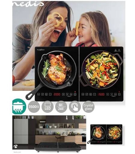 Nedis Plaque à induction Laquée - 2 zones - 3500 W - Affichage LED - Petit prix Protection contre la surchauffe