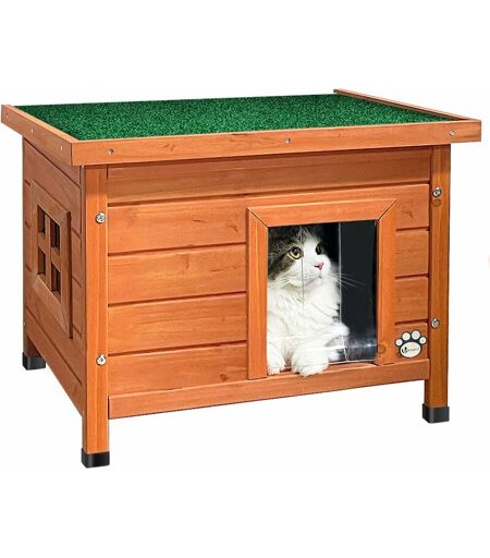 VOUNOT Maison pour chat niche en bois - toit bitumé autoportant et incliné - porte à lamelles - fenêtre en plexiglas
