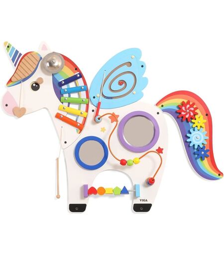 Panneau d'activités mural Licorne pour proposer aux enfants un apprentissage interdisciplinaire. Ce jouet d'activités mural en bois se compose de 4 sections, pour un transport et une installation faciles. Chaque section propose différentes activités de motricité fine et d'éveil aux enfants, en les encourageant à jouer ensemble ou individuellement : un circuit de perles, des engrenages mobiles ...