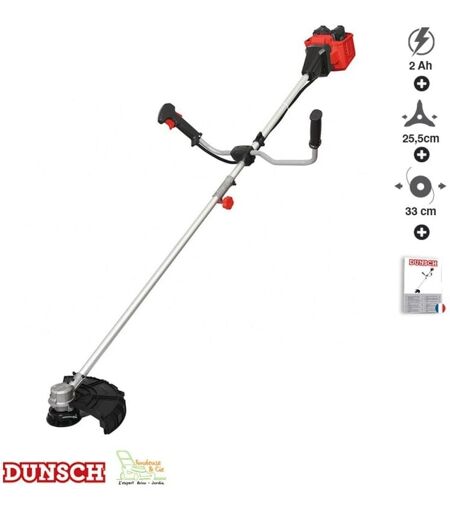 Rotofil sans fil à batterie sans fil 20v Dunsch DU22040BP pour débroussailler herbes sècles et finir votre travail après la tonte. Guidon double ergonomique avec arbre de transmission en 2 parties pour un rangement plus facile. Excellente maniabilité et précison de taille . Coupe assurée par une tête de fil de débroussailleuse pré-chargée coupe 33 cm ou une lame 3 dents largeur 25,5cm. Très bon équilibre de la débroussailleuse avec son moteur en tête. Carter de protection anti projection large, protège-plantes pour éviter les coupes intempestives. Faible nuisance sonore. Double gâchette pour une sécurité optimale. Livré sans batterie C20-20B ni chargeur C20-22AF. Possibilité de positionner 2 batteries 2ah référence C20-20B au besoin pour améliorer encore l'autonomie et le confort de travail. Garantie 2 ans. ...