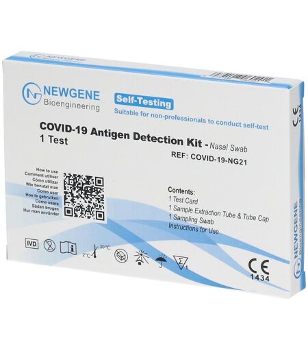 Le Newgene Kit de Détection d'Antigène COVID-19 est un autotest pour déterminer le risque de contamination par le coronavirus COVID-19.Ce produit est adapté à la détection qualitative des nouveaux coronavirus dans les échantillons d'écouvillons nasopharyngés ou de crachats. Il constitue une aide au diagnostic de l'infection par un nouveau coronavirus.Conseil d'utilisation1.Insérer délicatement l'embout de l'écouvillon à 2-3 cm dans la cavité nasale.Faire tourner délicatement l'écouvillon 5 fois pendant 20 secondes.Ne pas forcer l'écouvillon afin de ne pas blesser le nez.2.Insérer délicatement le même embout d'écouvillon dans l'autre cavité nasale.Faire tourner délicatement l'écouvillon 5 fois pendant 20 secondes.3.Retirer l'opercule en aluminium du tube de prélèvement de l'échantillon.Placer l'écouvillon dans le tube de prélèvement de l'échantillon. Utiliser l'écouvillon pour remuer la solution au moins 5 fois.4.Presser le tube avec les doigts.Déplacer l'écouvillon de haut en bas au moins 3 fois pour expulser toute solution du prélèvement de l'écouvillon.Retirer l'écouvillon.5.Insérer fermement le bouchon du tube sur le tube de prélèvement en question.Presser doucement le tube 3 fois pour mélanger la solution de prélèvement.Laisser le tube immobile pendant 1 minute.6.Claquer avec vos doigts sur le tube d'extraction d'échantillon pour mélanger la solution d'échantillon de manière optimale.7.Ouvrir la pochette pour en sortir une carte de test.Tenir le tube à l'envers.Ajouter 3 gouttes de solution de prélèvement dans le compartiment de la carte de test.8.Lire le résultat après 15 minutes.Le résultat est considéré comme inexact et non valide après 30 minutes.Ne pas remettre de solution échantillon sur une carte de test usagée.Pour les résultats, regarder la notice.Précautions d'emploiLisez attentivement le mode d'emploi avant d'utiliser ce produit.Ce produit est destiné à un usage professionnel UNIQUEMENT.Ce produit est applicable à l'écouvillon nasopharyngé et à l'expectoration L'utilisation d'autres types d'échantillons peut entraîner des résultats inexacts ou invalides.L'expectoration plutôt que la salive est le type d'échantillon recommandé par l'OMS. Les expectorations proviennent des voies respiratoires tandis que la salive provient de la bouche.S'il n'est pas possible d'obtenir des échantillons d'expectoration des patients, des échantillons par écouvillonnage nasopharyngé doivent être utilisés pour les tests.Veuillez vous assurer qu'une quantité adéquate d'échantillon est ajoutée pour le test. Une quantité trop importante ou trop faible d'échantillon peut entraîner des résultats inexacts.Si la ligne de test ou la ligne de contrôle est en dehors de la fenêtre de test, n'utilisez pas la carte de test. Le résultat du test n'est pas valable et il faut recommencer le test avec un autre échantillon.Ce produit est jetable. NE PAS recycler les composants usagés.Éliminez les produits, échantillons et autres consommables usagés comme des déchets... ...