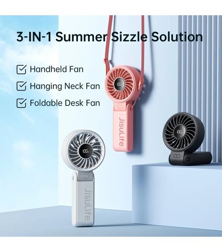 Ventilateur portatif JISULIFE avec affichage LED, 5 vitesses, 5000 mAh, 150 ° Plié, ventilateur personnel multifonction 3 en 1 main/bureau/cou