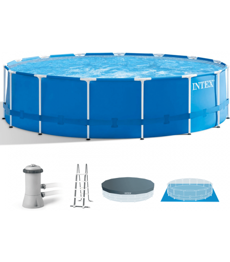 Pays de fabrication Chine, Forme Ronde, Largeur piscine 457cm, Hauteur piscine 122cm, Hauteur max de l'eau 103cm, Capacité piscine 16805L, Nb maximal de personnes 9-10, Couleur piscine Bleue, Débit horaire max pompe 3785L/h, Filtre À cartouche, Bâche de protection Incluse, Tapis de sol Inclus, Échelle Incluse ...