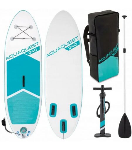 • Ailerons, gonfleur, poignée, l'équipement complet du Paddle Aqua Quest • Pour gonfler facilement le SUP d'Intex, tout est fourni. Le gonfleur est un modele manuel a double action qui permet de gonfler et dégonfler le paddle en moins de 10 minutes. Il est muni d'un manometre pour plus de précision. La valve de gonflage, elle, est située a l'arriere du Paddle. • Hormis la pome de gonflage, plusieurs autres accessoires équipent le paddle Aqua Quest : • 3 Ailerons (2 petits et un grand) a l'arriere de la planche pour gagner en stabilité. • 1 Pagaie ajustable en aluminium. La pagaie fournie est résistante et a une poignée ergonomique (taille de 1,65 m a 2,16 m). • 1 Leash a accrocher a la cheville pour plus de sécurité. • 1 Sac a dos pour protéger et transporter facilement la planche une fois dégonflée. • 1 Poignée centrale souple pour transporter facilement le SUP jusqu'a l'eau. • 1 Corde de stockage a l'avant de la planche pour coincer ses affaires lors de l'utilisation. La corde peut etre particulierement utile pour y garder un sac étanche lors des longues balades. Caractéristiques paddle gonflable intex aqua quest 320 • Dimensions extérieures: L 320 x l 81 x H 15 cm • Composition: PVC / Drop Stitch / EVA pad • Poids maximum supporté: 150 kg> ...