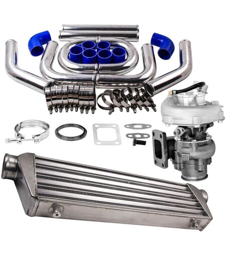 Description générale Ce kit complet comprend un turbocompresseur, un refroidisseur d'eau et un kit de tuyauterie intercooler en aluminium, idéal pour améliorer les performances des moteurs de 2.0L à 3.5L avec 4 ou 6 cylindres. Il est conçu pour maximiser l'efficacité volumétrique des moteurs à combustion interne en refroidissant l'air d'admission, ce qui augmente la densité de charge d'air. Spécifications techniques Puissance de boost jusqu'à 420 HP Taille d'entrée/sortie: 2.5'' Taille globale du refroidisseur: 27'' x 7'' x 2.5'' Taille du noyau: 21'' x 7'' x 2.25'' Compresseur A/R: 0.5 Turbine A/R: 0.63 Échappement du turbocompresseur: bride T3/T4 4 boulons Diamètre de l'évacuation du compresseur: 50.5 mm Diamètre de l'évacuation de la turbine: 65.5 mm Compatibilité et accessoires Ce kit est universel et compatible avec tous les turbocompresseurs. Le contenu du kit de tuyauterie inclut: 2 tuyaux en aluminium à 90 degrés (2.5') 2 tuyaux droits en aluminium (2.5') 2 tuyaux en aluminium ...