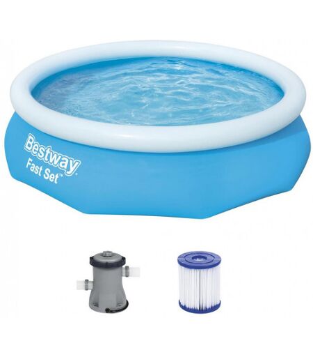 Facile et rapide a monter, le kit piscine Fast Set™ de Bestway® vous permettra de vous prélasser au bord de votre nouvelle piscine en un rien de temps. Cette piscine est idéale pour amuser vos enfants et leur faire découvrir le plaisir d’une baignade et les joies de la piscine en toute sécurité. Les enfants vont adorer passer leurs journées d’été a s’éclabousser et a jouer dans l’eau, et les parents pourront également profiter d’une baignade agréable et relaxante. La pompe de filtration inclue avec la piscine vous aidera a garder une eau propre. L’été n’est pas vraiment l’été sans la piscine Fast Set™ de Bestway® ! Caractéristiques: Dimensions: 305 x 76 cm Volume d'eau a 80%: 3 200 L Débit d'eau de la pompe: 1 249 L Compatibilité des cartouches: Cartouche 58093 (I) Matériau: Duraplus™ Temps de montage: 10 minutes Contenu: 1 piscine 1 pompe de filtration 1 cartouche de filtration Technologies: Avec son procédé d’installation ultrasimple Fill & Rise™, pas de prise de tete ! Il vous suffit de choisir une surface plane, de gonfler l’anneau supérieur et la piscine se levera au fur et a mesure qu’elle se remplira d'eau. Le liner est fabriqué en DuraPlus™, un matériau extremement résistant fait de 3 épaisseurs renforcées, 85 % plus résistant a la perforation que le PVC. Il est réputé pour sa résistance a la perforation, sa durabilité et sa longévité. Photo d'illustration> ...