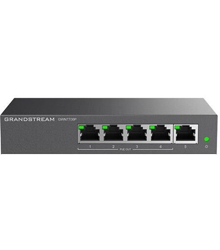 Grandstream Networks GWN7700P. Type de commutateur: Non-géré. Type de port Ethernet RJ-45 de commutation de base: Gigabit Ethernet (10/100/1000), Quantité de ports Ethernet RJ-45 de commutation de base: 5. Répertoire MAC: 2 entrées, Capacité de commutation: 10 Gbit/s. Standards réseau: IEEE 802.1p, IEEE 802.1x, IEEE 802.3ab, IEEE 802.3ae, IEEE 802.3af, IEEE 802.3aq, IEEE 802.3at,.... Voltage d'entrée DC: 48 V. Connexion Ethernet, supportant l'alimentation via ce port (PoE) ...