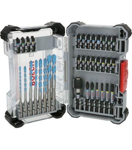 PRO Impact Mixed Set – Pour les visseuses a percussion, Pour perceuses/visseuses rotatives, Pour perceuses / visseuses a percussion Conçu pour les applications de vissage intensives et le perçage de précision dans divers matériaux Vissage robuste et perçage de précision dans les matériaux de construction La zone de torsion étendue absorbe les contraintes de couple a la pointe de l'embout de vissage Vissage robuste et perçage de précision dans les matériaux de construction 1La zone de torsion étendue absorbe les contraintes de couple a la pointe de l'embout de vissage 2L'acier modifié traité thermiquement garantit la solidité des embouts de vissage et leur résistance a un couple élevé 3Percer avec précision devient un jeu d'enfant avec la technologie Bosch Centering Geometry 4Percez les trous avec précision grâce a un design spécial sur la pointe de centrage PRO Impact Mixed Set pour un vissage robuste et un perçage de précision dans les matériaux de construction Vous avez besoin d'un coffret d'embouts de vissage robustes et de forets multi-matériaux pour vos travaux d'aménagement intérieur ? Essayez le coffret PRO Impact Mixed Set. Les embouts de vissage sont fabriqués en acier modifié pour plus de solidité et présentent des marquages au laser pour vous aider a choisir l'embout dont vous avez besoin. Les forets sont fabriqués dans le meme acier modifié, avec des pointes en carbure pour vous aider a percer facilement de nouveaux trous. Le coffret PRO Impact Mixed Set est un excellent choix pour les décorateurs d'intérieur et les installateurs qui ont besoin d'embouts de vissage et de forets fiables. Les embouts de vissage comportent une zone de torsion qui absorbe la contrainte de couple au niveau de la pointe des embouts afin qu'ils ne cassent pas. Les embouts comportent des anneaux de couleur indiquant le type de tete et des marquages au laser pour vous aider a choisir celui dont vous avez besoin. Les forets EXPERT HEX-9 Multi Construction ont des aretes de coupe résistantes et des pointes en carbure pour plus de dureté. Leurs goujures éliminent efficacement les copeaux et prolongent ainsi la durée de vie des forets. Ce coffret est livré dans un boîtier robuste et disposé dans des supports que vous pouvez utiliser pour créer votre propre boîte a outils.> ...