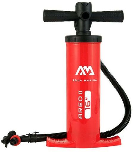 La pompe Areo II 16'' de chez AQUA MARINA est un gonfleur double action qui vous permettra de gonfler votre kayak rapidement ! Elle est livrée avec 5 embouts afin de pouvoir s'adapter à tous les kayaks du marché ! Caractéristiques techniques : Livré avec 5 valves universelles Pression maxi : 14.5 PSI Double action Tuyau accordéon s'étirant jusqu'à 120 cm Volume : 2 x 1400 cc Manomètre à air inclus Dimensions : 21.5 x 10 x 41 cm. ...