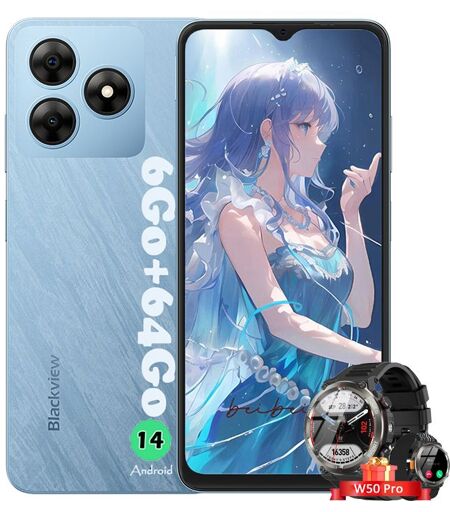 Blackview WAVE 8C Smartphone 6.56" 6Go+64Go 13MP 4700mAh Dual SIM Android 14 Bleu avec Smartwatch Blackview W50 Pro