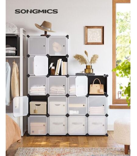 Songmics - Meuble de Rangement Modulable, 16 Compartiments, Étagère en Plastique, avec Portes, pour Vêtements, Chaussures, Jouets, Livres, Assemblage