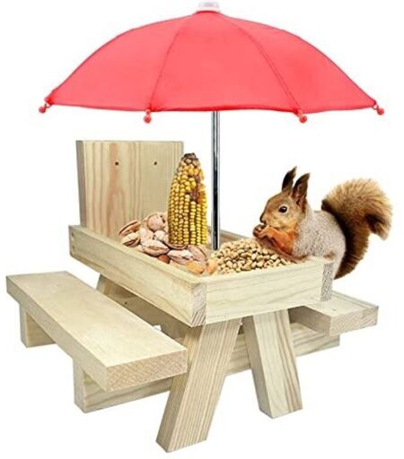 LARGEIGHT Mangeoire Ecureuil Exterieur, Mangeoire pour écureuils, Mangeoire à écureuil en Bois, Table De Pique-Nique écureuil avec Parapluie Et Porte Maïs pour