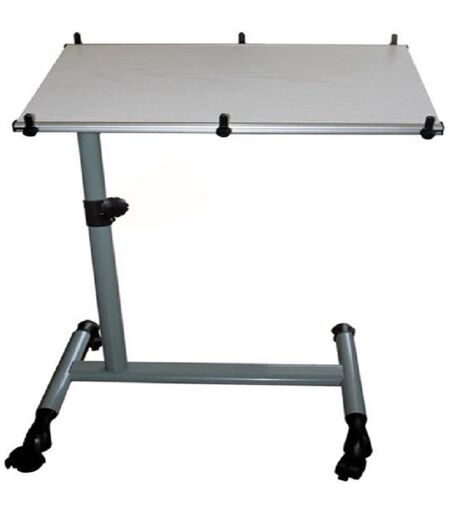 Matériau du plateau : panneau de copeaux avec enrobage, avec deux bandes en aluminium à 2 cotés; Matériau du pied : tube métallique Plateau multi-positions : 33 x 52 cm Plateau réglable en Hauteur : 61.5 à 85.0cm Hauteur du piétement à roulettes (pour passage sous sommier) : 7,5 cm. Hauteur du piétement à bourrelets (pour passage sous sommier) : 5,0 cm. ...