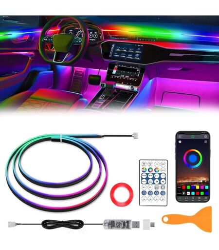 【LED automatique en acrylique】 l'éclairage intérieur LED automatique en acrylique le plus cool par rapport aux lumières à fibre optique, plusieurs accessoires automobiles LED intégrés peuvent fournir une lumière vive et des couleurs vives, plus lumineuses et plus uniformes qu'un tube de lumière LED et plus douces. 【Plusieurs modes de contrôle】Contrôlez efficacement l'éclairage intérieur de votre voiture via l'application Bluetooth, la télécommande et l'USB, profitez de dizaines de milliers de couleurs et de plus de 200 modes dynamiques, luminosité/vitesse, réglage de la minuterie. Parfait pour vos différentes humeurs de conduite ou différentes décorations de vacances. 【Suivez votre musique】 L'intérieur de la voiture LED dispose non seulement d'un mode de commande vocale intégré avec sensibilité réglable, mais également d'un mode musique avec sensibilité réglable et contrôle de la roue chromatique. L'éclairage intérieur LED de la voiture clignotera au rythme et au rythme de la musique, ...