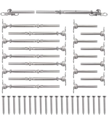 APPLICATIONS : Ce kit de quincaillerie pour garde-corps d'escalier de 3/16" est compatible avec les câbles en acier inoxydable de 3/16". Grâce à sa fonction multi-angle et à son corps fermé réglable, le tendeur pivote de 0 à 180 degrés et ajuste librement sa longueur. Ce tendeur à bascule serti peut être utilisé sur des garde-corps d'escalier d'angle ou des garde-corps horizontaux. Convient pour une utilisation en extérieur comme en intérieur. ACIER INOXYDABLE T316 : Fabriqué en acier inoxydable T316, ce qui le rend insensible à la rouille. Grâce à son matériau, il peut être installé aussi bien à l'intérieur qu'à l'extérieur. À utiliser avec des poteaux en bois. DIMENSIONS : Tendeur = 7,3" (min) - 10,3" (max), extrémité de la bascule de pont = 2,95", vis en acier inoxydable T316 = 1,40". Convient aux câbles en acier inoxydable de 3/16". Si vous utilisez un tendeur à rotule, rallongez-le pour permettre le serrage du câble une fois installé. 【FACILE À INSTALLER】 : Ces embouts de ...